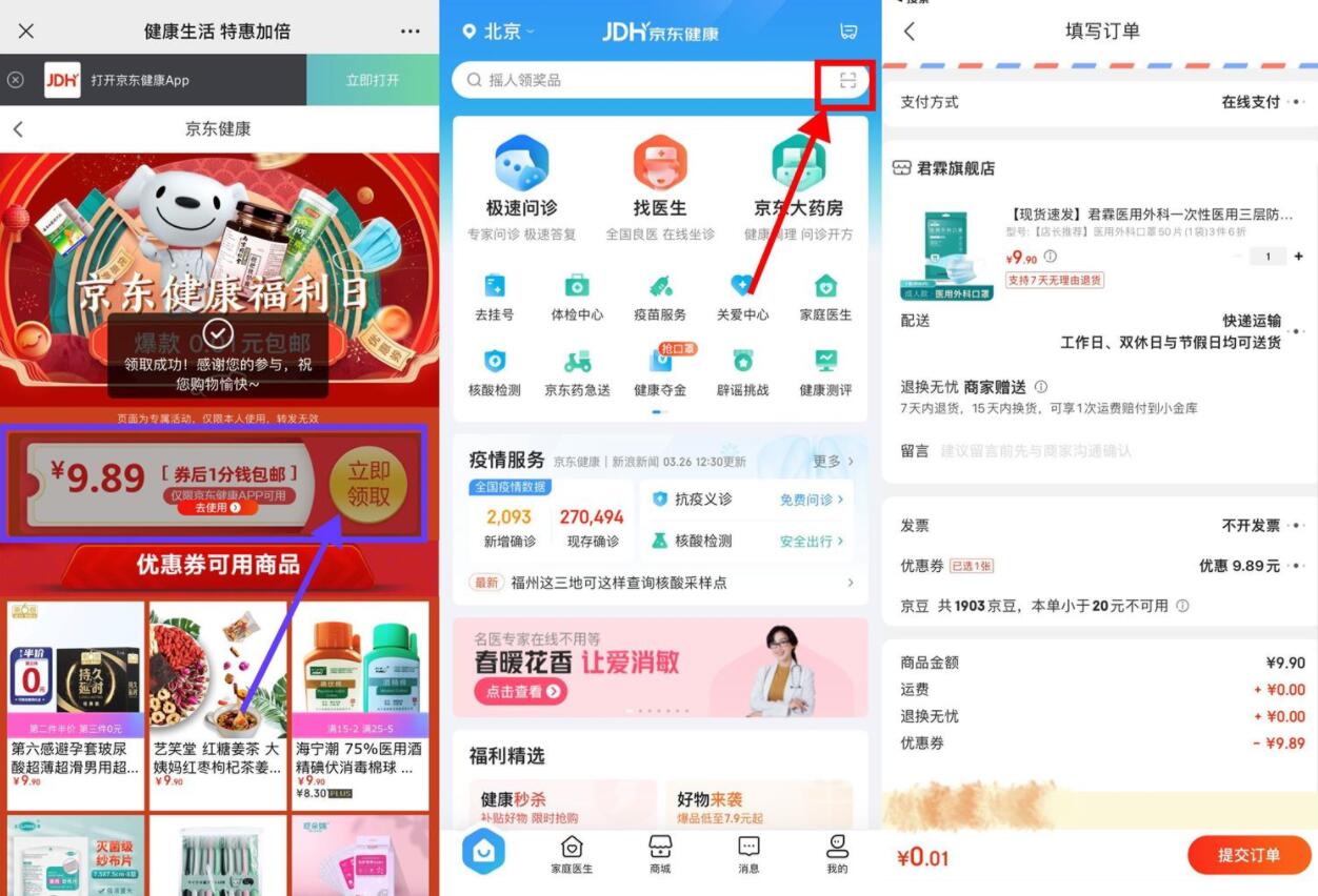 打開活動地址->領取9.89元優惠券->京東健康APP掃碼打開購買地址->下單自動抵扣1分錢包郵